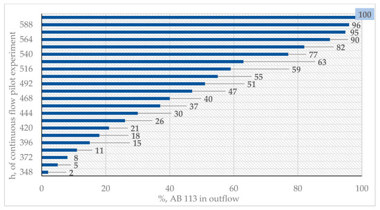 V = 0.074(). Samples were taken after 12 h and the inflow and outflow concentrations of AB 113 were determined using spectrometric equipment, see Figure 8. From the outflow, samples were collected for 600 h (25 days) and 50 effluent samples were taken every 12 h. The AB 113 dye was completely removed by the resin bed after 336 h. After, 348 h, the percentage of AB 113 in effluent was detected over the determination limit of the analytical method, with the behavior presented in Figure 8 and Figure 9. After 600 h, saturation of the resin bed was observed, with the initial concentration of inflow being equal to the outflow concentration. Awasthi and Datta presented a column through which 10,000 L/day of textile effluent had been treated by applying a column experiment. Characteristics of the column were: 0.1127 m ID, 0.0199 m height containing 0.066 kg of Amberlite XAD-7HP resin impregnated with Aliquat 336 [44]. Sinha et al. studied the removal of Congo Red Dye using a fixed bed of Amberlite IRA 400 with continuous flow. The service time and bed depth service parameters were studied in order to optimized the process [23].