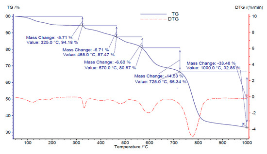 Thermal analysis techniques are frequently used in order to obtain useful information concerning the composition and stability of different species such organic azo dye [45]. In order to obtain such information, the thermal behavior of AB 113 was investigated by TG analysis. The TG and DTG curves corresponding to AB 113 dye thermal behavior indicate that its decomposition in argon atmosphere follows several steps. The first step constitutes the release of water molecules up to 150 °C. The anhydrous species then undergo gradual degradation. According to the data the residual mass formed at 800 °C is 32.86%, as presented in Figure 12.