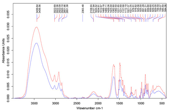 FTIR spectra of pure IRA 402(Cl−) resin (red line) and of AB113 loaded resin (blue line).