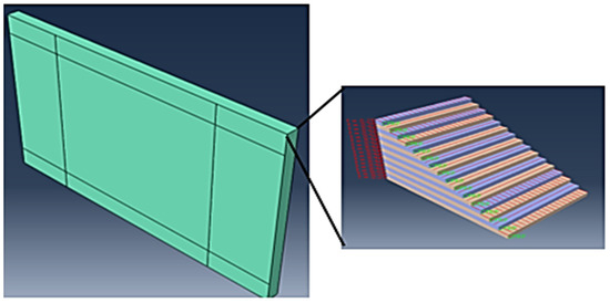 The 30 mm × 50 mm workpiece was modelled in Abaqus/CAE. The CFRP workpiece was modelled with two fibre orientations (0° and 90°) in a 21-layer setup by using the composite layup option in Abaqus. The properties of the 3D deformable solid in the extrusion mode were applied to the workpiece. To simulate the composite characteristics, cohesive elements were added to the model with the cohesive surface parameters. The CFRP ply stack plot is shown in Figure 2.