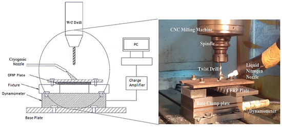A computer numerical controlled (CNC) vertical drilling machine (Model: SURYA VF30, BFW—India, Bangalore, India) was used for conducting the experiments. The drill used was an 8 mm solid carbide drill (uncoated) from Kennametal with a point angle of 130°. Solid carbide drills have excellent thermal stability, which was of prime importance while drilling under cryogenic conditions. After each experiment, a new drill bit was used to minimise errors due to tool wear. The experimental setup adopted in this research is presented in Figure 4.