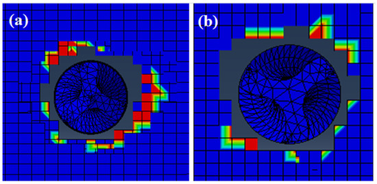 Reduced-integrated 8-node shell elements were used for the meshing of the CFRP plate. Cohesive behaviour was given between the plies for the simulation. The mesh density around the drilled hole was considered up to the element size of 0.05 mm to reduce the computational cost and to optimise the results for a clearer picture of the delaminated area. The element deletion criterion was activated to delete any excessively damaged elements. This is an important step as undeleted elements cause computational errors and problems during visualization. A finer mesh was given to the area which was facing damage, while the ends of the workpiece were given a coarser mesh size. The mesh was a hex element shaped to mesh with a swept structure, which allowed the mesh to be even on both the front and backside of the workpiece. An advanced front meshing algorithm was used as per the default setting in the software. An SC8R mesh was used during the thermal analysis as the use of a thermal shell created problems in the convergence of the simulation. The detailed specifications of both the workpiece and tool meshing are listed in Table 2.