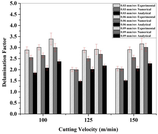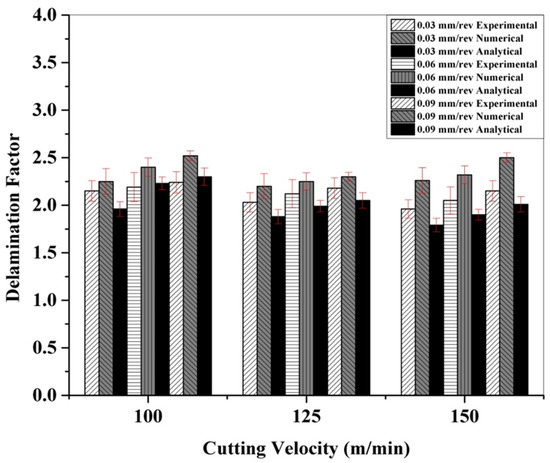 The influence of the feed rate and cutting velocity on the delamination factors under cryogenic-assisted CFRP drilling is presented in Figure 7. As observed in dry drilling, in cryogenic drilling, the delamination factor was also found to increase with increased feed rates at a constant cutting speed. But their values were considerably lower than that of dry drilling. The numerical and analytical results followed the same trend of the experimental outcomes. This can be inferred from Figure 7. A reduced delamination factor at increasing cutting speeds and fixed feed rates is attributed to the reduction in the thrust force, which leads to less damage induced on the CFRP [7].
