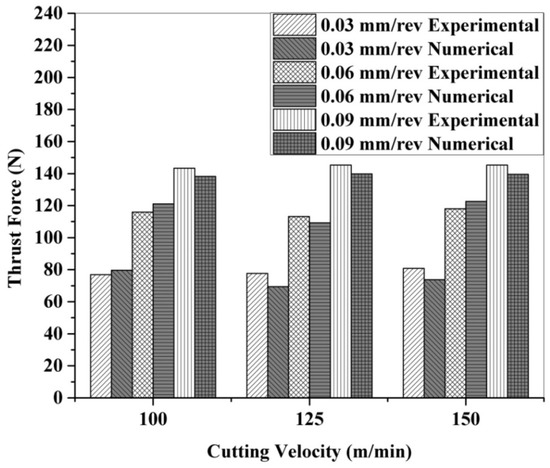 The experimental and numerical predicted thrust force for CFRP drilling in a dry environment under different operating parameters is shown in Figure 8. The trend of an increased thrust force with increasing feed rates at a constant cutting speed might be associated with the reduction in the clearance angle [25]. The cutting speed has very little effect on the thrust forces because the mechanism of cutting in composites is based on bending fracture. Due to work hardening, high magnitude thrust forces are developed with increasing cutting speeds in metals. However, this phenomenon is not observed in composite laminates [26,27,28]. The experimental value is found to be in the range of 77–146 N for dry drilling. In addition, the numerically predicted results are found to be in the acceptable range (within 10%) of experimental observations.