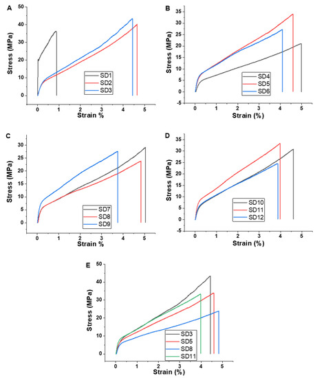 Tensile tests results for the polymer films: (A) SD1, SD2, SD3; (B) SD4, SD5, SD6; (C) SD7, SD8, SD9; (D) SD10, SD11, SD12; (E) SD3, SD5, SD8, SD11.