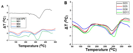 DTA thermograms for the polymer films (A) neat APV, SD1, SD2, SD3 and (B) SD3, SD5, SD8, SD11.