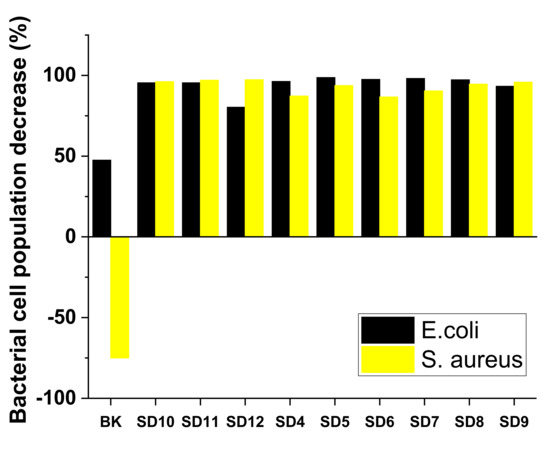 A time-kill assay was performed on E. coli and S. aureus. After the proposed contact times (2 h and 24 h) between strains and bentonite-supported nanoparticle solutions, bacterial growth was evaluated. In the case of the time-kill assay, it is observed that after 2 h of contact, all the decontamination solutions showed activity against both micro-organisms. After periods longer than 2 h of contact, in the case of E. coli strains, an increase in the number of CFU/mL was observed. Most likely, in the case of this bacteria, nanoparticles adhered to the surface of the cells or penetrated inside the membranes and were blocked. It is known that nanoparticles containing Cu, Zn, and Ti ions bind to negatively charged membranes (such as E. coli) [56]. This would explain the survival rate and resumption of the growth and division cycle. Considering that after 2 h of contact, an accelerated increase in the number of CFU/mL was observed, only the values recorded at time t1 (2 h of direct contact) were represented graphically (the results are illustrated in Table 5, Figure 8, and Figure S3), highlighting their antimicrobial activity during the short contact period. In the case of S. aureus, the activity is more pronounced, with observed antimicrobial activity even after 24 h in the case of SD7, SD8, SD9, SD10, SD11, and SD12 (results illustrated in Figure S4). The substrate solution (BK) has a slight activity on E. coli but no activity on S. aureus.