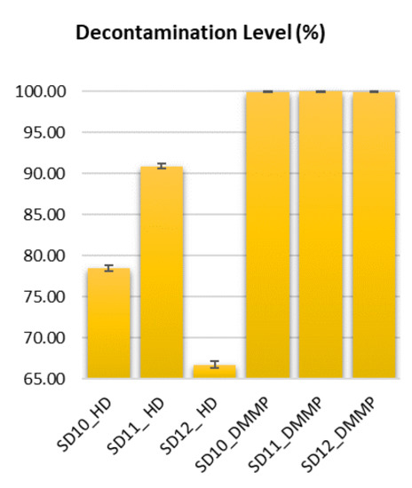 As it can be noticed in Table 7 and Figure 10, the SD11 decontamination solution achieved the highest decontamination factor for HD. In the case of DMMP, employed as simulant for nerve chemical agents, the decontamination factors obtained were much higher, with all decontamination solutions (SD10, SD11, and SD12) being highly efficient. It is well known that HD is more difficult to decontaminate due to its chemical structure, as it tends to establish stronger interactions with the metallic substrate on which it is deposited. Even so, SD11 managed to efficiently remove more than 90% from the contaminated surface. The other decontamination solutions were not so efficient, probably due to their composition. We can presume that SD10 was not able to entrap the same amount of toxin, probably due to the lower content of bentonite, which was reflected in a higher residual contamination ≈ 21.72%. On the other hand, even if SD12 had more bentonite and theoretically greater adsorptive capacity, having a slightly higher viscosity and less NP active centers (bigger NPs and lower specific surface) with decreased mobility in a more viscous media, this could have led to much lower DF values.