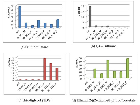 Chemical decontamination tests followed the biological decontamination tests. Since the biological decontamination tests showed that the solutions based on bentonite-supported silver nanoparticles displayed the best results, we employed only these solutions (SD10, SD11, and SD12) for the tests performed on real chemical warfare agents. This choice was also influenced by safety concerns, as working with real warfare agents imposes higher risks and requires specially trained personal. Thus, we tried to limit the number of experiments by employing only these three decontamination solutions, and we maintained the relevant steps for the decontamination procedure in order to obtain accurate information. For the same reasons, we also tested a simulant. Chemical decontamination of metallic surfaces measuring 10 cm2 was accomplished in three stages: the first one consisted of the controlled contamination of the metallic coupons with HD and DMMP (10 mg/10 cm2), respectively; the second one consisted of applying the decontamination solution on the contaminated surface and allowing it to neutralize the toxin and to form the film by evaporation of the solvent at room temperature (25 °C); the last step consisted of DCM extraction of the decontaminated surface and of the peeled film. The results obtained for HD and DMMP are presented in Table 7, Figure 10. Some relevant chromatograms were selected and are shown in Figures S6–S9.