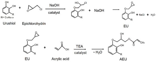 The urushiol was extracted from the oriental lacquer using the acetone as a solvent, and then the acetone was removed by vacuum distillation. The 100 g urushiol was mixed with epichlorohydrin with a urushiol/epichlorohydrin mole ratio of 0.0625, and 5 g benzyltriethylammonium chloride was added as a catalyst. The reaction was carried out at 60 °C for 3 h, and 60 g of 50% NaOH (aq) was added dropwise in the following 3 h. Next, the reaction was continued and kept at 60 °C for another 1 h. The mixture was cooled to room temperature and the acetone was added to purify and precipitate the generated NaCl. Finally, the excess of epichlorohydrin and acetone was removed by vacuum distillation and the EU was obtained. Subsequently, the EU was mixed with the acrylic acid with a COOH/epoxide mole ratio of 1, and 1 phr TEA was added as a catalyst. The reaction was maintained at 80 °C for 5 h. After cooling the mixture at room temperature, the water was removed by vacuum distillation, and the AEU was obtained. The synthesized process is drawn in Figure 1.
