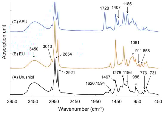 FTIR spectra of (A) urushiol, (B) EU, and (C) AEU.