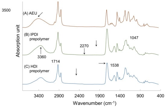 FTIR spectra of (A) AEU, (B) IPDI-containing prepolymer, and (C) HDI-containing prepolymer.