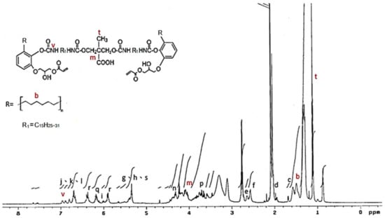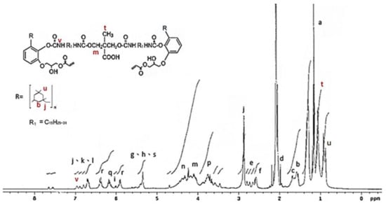 The 1H NMR analysis of the AEU is drawn in Figure 4. The signals at 0.70–3.00 ppm were assigned to the protons in the saturated alkyl group of the AEU side chain. Among these ranges, the signal at 1.29–1.35 ppm (a) represented the protons of methylene (–CH2–), and the signal at 1.59 ppm (b) was the signal of the protons in the second methylene linked to the phenol (Ph–CH2–CH2–). The signal at 1.67 ppm (c) was generated from the protons of the terminal methyl group. The peak at 1.97 ppm (d) was assigned to the protons in the unsaturated double bond (–CH2–CH=). The peak at 2.80 ppm (e) was the signal of methylene linked to the phenol (Ph–CH2–). The peaks at 2.59–2.61 ppm (f) were assigned to the unconjugated double bond (=CH–CH2–CH=). The peaks at 6.55–6.59 ppm (j, k, l) were associated with the benzene ring, and the peaks at 5.98–6.05 ppm (i) were assigned to the conjugated double bond (–CH=CH–CH=CH–). These results showed that the main structure and specific groups of the urushiol were retained. In addition, the signal at 4.02 ppm (m) was the generated methylene protons after the ring-opening reaction. The peaks at 5.31–5.39 ppm (g) were assigned to the protons in the double bonds of the side chains (–CH=CH–), phenols (h), and protons in the generated hydroxyl groups after the ring-opening reaction (–OH) (s). The results mentioned above confirmed that the epoxide reaction of urushiol and epichlorohydrin progressed well. Furthermore, the peaks at 6.15–6.19 ppm (q) were associated with the proton of the acryl group (O=C–CH=), and the peaks at 5.89–5.91 and 6.33–6.40 ppm (r) were assigned to the terminal protons of the acryl groups (O=C–CH=CH2) [36,37,38,39]. These results revealed that the terminal double bonds derived from acrylic acid were introduced into the AEU molecule successfully.