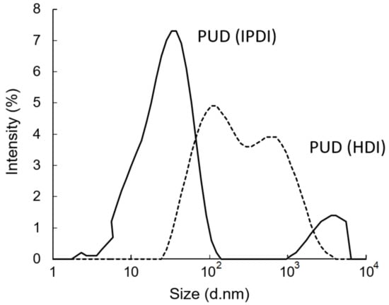After removing the acetone from the water–acetone dispersions by vacuum distillation, the polyurethane dispersions (PUDs) were obtained. The appearances of the prepolymers and PUDs, which were synthesized from the HDI and IPDI, respectively, are listed in Figure 12. The appearance of the IPDI-containing prepolymer was light-brown in color (A), and the IPDI-containing PUD displayed a semitransparent and light-yellow color (C). The HDI-containing prepolymer also displayed a light-brown color (B), while the appearance of the HDI-containing PUD was opaque and of a milky-brown color (D). These phenomena can be attributed to their fundamental properties, which are listed in Table 2. Although the IPDI-containing and HDI-containing PUDs demonstrated similar solid contents of 25.2% and 26.2%, and similar pH values of 7.8 and 7.6, the obvious differences were found in the viscosity and particle size of the PUDs. The IPDI-containing PUD featured a smaller z-average particle size of 80 nm, and its PDI was a narrow distribution of 0.217. By contrast, the HDI-containing PUD demonstrated a larger z-average particle size of 158 nm and a PDI of 0.524, indicating a more uneven particle composition than the IPDI-containing PUD. The particle size distributions of the PUDs measured by dynamic light scattering (DLS) are shown in Figure 13. The appearances of the waterborne dispersions are associated with their particle size. When the WPU has a smaller particle size, a more transparent appearance is observed [25,44]. In this study, the HDI-containing PUD had a particle size of 158 nm and an opaque and milky-brown color, while the IPDI-containing PUD was 80 nm, and a semitransparent and light-yellow color was obtained. In a study by Ley et al. [45], waterborne coatings prepared by different acrylic acids featured different particle sizes, from 145 to 177 nm. Nanda et al. [46] found that the particle sizes of their WPU coatings are relatively small, from 40 to 140 nm, according to the differences between the components. In this study, the particle sizes of IPDI-containing and HDI-containing PUDs were also confirmed, in line with those reported previously.