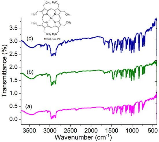 Initially the IR spectroscopy measurements of the porphines were performed with the purpose to identify their main bonds. Subsequently, during the deposit of the films with PEDOT:PSS, the measurements could monitor their chemical stability. The intensity and frequency of the absorbed IR are strongly dependent on the type of the bond. FTIR spectra of powder porphines are illustrated in Figure 2 and the observed IR bands and their assignments are presented in Table 1, being in a good agreement with the literature [29,30,33,34,35,36]. The spectra of the three metalloporphines (MPs M = Co, Cu, Pd) are almost similar except for some minor differences that appear in the relative intensity, shape, and position of some bands [30].