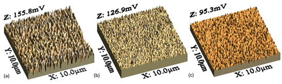 AFM images of (a) PEDOT:PSS-CoP, (b) PEDOT:PSS-CuP, and (c) PEDOT:PSS-PdP composites films.