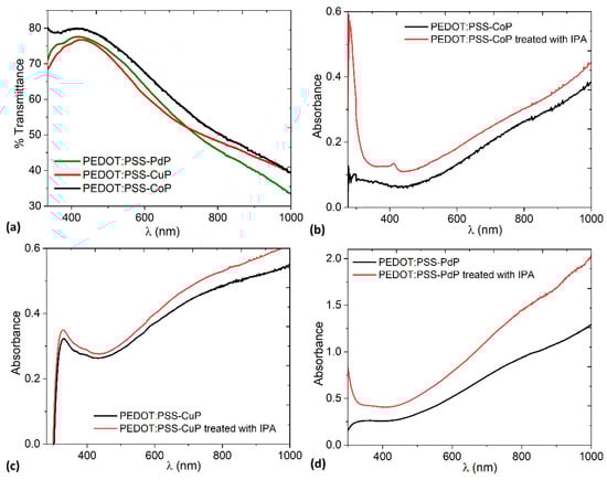 Spectral behavior of the (a) transmittance and absorbance for (b) PEDOT:PSS-CoP, (c) PEDOT:PSS-CuP, and (d) PEDOT:PSS-PdP films without and with IPA treatment.