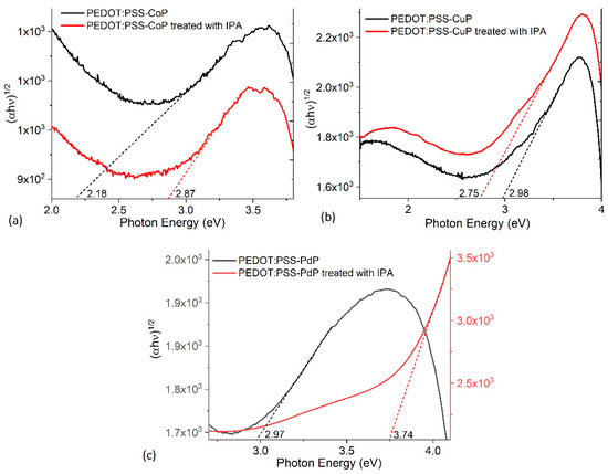 Bandgap plots for (a) PEDOT:PSS-CoP, (b) PEDOT:PSS-CuP, and (c) PEDOT:PSS-PdP films without and with IPA treatment.