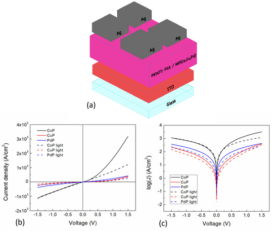 Figure 8a shows the simple device structure of the PEDOT:PSS-MP composite films for the electrical characterization, where silver and ITO are used as cathode and anode, respectively. A conduction channel area of 1.39 × 10−6 cm2 was used. The PEDOT:PSS flexibility may be affected by the incorporation of each porphine as previously observed for other incorporated materials [53,54], whereas for the porphine no previous studies have been conducted. Figure 8b shows J-V curves and its (c) semilogarithmic curve for the different porphines under darkness and light conditions. As can be observed, the measured curves show a non-linear behavior that resembles a Schottky barrier device for all the MP films, where a non-symmetrical curve is observed for the forward and reverse bias regions. The latter indicates that the incorporation of the MPs into the PEDOT:PSS induces a junction formation, and the films current transport mechanisms are changed. Apparently these MPs are incorporated as nanoparticles within the PEDOT:PSS, affecting the electrical properties. In the forward bias region (Figure 8b), an increase in current density is observed for all the composite films curves in such a way that at 1.5 V it reaches 3.19 × 103 A/cm2 for CoP (the highest value), 3.95 × 102 A/cm2 for CuP, and 4.28 × 102 A/cm2 for PdP. The value for CoP is eight times larger compared to the one obtained for CuP. These observation may be related to the CoP homogenous micro-grained morphology, denser film, less quinoid structure, and its lower interaction with the PEDOT:PSS, compared to the CuP composite film. These results suggest that the CuP composite film needle shaped structure morphology and the higher degree of interaction with the PEDOT:PSS quinoid structure affects the conduction mechanisms, diminishing the J-V characteristics. On the contrary, in the reverse bias region (Figure 8b), a decrease in all the composite films curves is observed. At 1.5 V it is observed that the CoP has the lowest current density of −1.16 × 103 A/cm2, with the CuP of −2.49 × 102 A/cm2 and the PdP of −3.82 × 102 A/cm2. However, the CoP value is 4.6 times larger compared to the CuP. Moreover, J-V characteristic measurements were conducted under light conditions and plotted on Figure 8b,c for comparison with the J-V curves in darkness conditions. Figure 8b shows that CoP composite film presents, on the forward bias region at 1.5 V, a current density of 1.23 × 103 A/cm2 (61% decrease), whereas the CuP and PdP of 3.37 × 102 A/cm2 (15% decrease) and 2.69 × 102 A/cm2 (37% decrease), respectively. This light induced change observations may be related to the change of the RMS and a more quinoid structure, which is higher for the CoP, affecting the light absorption and conductivity in a greater manner. On the reverse bias region at 1.5 V, there is a current density of −1.13 × 103 A/cm2 for the CoP, and for the CuP and PdP of −1.53 × 102 A/cm2 and −2.31 × 102 A/cm2, respectively. These values correspond to a 3%, 39%, and 40% decrease, respectively for the CoP, CuP, and PdP composite films. Figure 8c allows a more detailed comparison between the semiconductor films and under light conditions, where a short circuit current (Jsc) variation can be observed. The latter is a consequence of the MP, by which the semiconductor material output could determine its application on optoelectronic devices, like solar cells, sensors, photodiodes, and others. In addition to the current density variations shown on Figure 8c, it is interesting to note that the reverse bias region curves for darkness conditions show a similar curve shape, contrary to what is observed for the forward bias region.