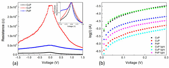 Figure 9a shows the voltage dependent semiconductor resistance for each of the compound films. As can be observed, the CuP film presents the highest resistance, and it approaches 2.60 × 104 Ω at very low voltages. A lower resistance is presented by the PdP, which approaches 5.06 × 103 Ω at very low voltages, and the lowest resistance is presented by the CoP, which approaches 1.37 × 103 Ω at very low voltages. First, it is important to note that the semiconductor resistance decreases with the voltage increase, both negatively and positively. A more pronounced variation on the device resistance decrease is observed for the CuP composite film. In addition, a slight variation of the curve decay is observed between the forward and reverse bias for all the composite films. Figure 9a inset shows the normalized resistance to analyze the variation of the semiconductor resistance for the different MP composite films. It can be observed that all curves present different behavior. The PdP curve shows a very asymmetrical shape: for forward bias a steep decrease is observed, whereas for reverse bias a gentle decrease of almost the half of the previous observation is shown. It is interesting to note that for the forward bias region, the curves decay trend to zero at 1.5 V and the broadest curve is for the CuP, whereas the sharpest is for the PdP. However, for the reverse bias region, the curves decay to different values at −1.5 V, the CoP being the lowest, followed by CuP and PdP, respectively. The latter indicates that the PEDOT:PSS-MP composite films present different conduction mechanisms by changing the MP, and are bias dependent, which is a consequence of the charge carrier type mobility within the film. Figure 9b shows the semilogarithmic I-V curves for the different porphines under darkness and illuminated conditions for the 0–0.3 V voltage range. It can be observed a variation of almost 1.5 orders in magnitude for the current comparing the various composite films. Furthermore, under light conditions a more detailed effect can be observed. The CoP curve presents a higher current value for the light condition for voltages lower than 0.15 V, but for the CuP and the PdP the current values for the light condition are lower for all the voltages.