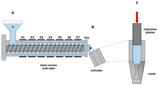 A lab-scale co-rotating twin-screw extruder (Process 11, Thermo Scientific, Karlsruhe, Germany) and piston injection molding apparatus (Haake MiniJet II, Thermo Scientific, Karlsruhe, Germany) were used for the production of a dumbbell-shaped specimen. The dried granulate was fed through the feed hopper at a constant speed of 4 rpm into the twin-screw extruder, equipped with standard screws with a diameter of 11.0 mm and an L/D ratio of 40.0. The screw assembly includes feed screw elements (1.0 L/D), three mixing zones with kneading elements (⅟4 L/D), and a discharge element (1 ½ L/D) at the end (Figure 1A). A total granulate sample weight of about 10–15 g was used in order to make three replicates per processing condition. The melted polymer was immediately transferred from the extruder die-end into a heated injection cylinder (Figure 1B), which was mounted on top of a heated dumbbell-shaped mold in which the polymer was ultimately injected (Figure 1C). The injection unit pushes the polymer melt in the mold with a piston, resulting in samples of approximately 1.5 g. Afterward, the polymer samples were manually ejected from the mold and conditioned at 23 °C and 50% RH (relative humidity) for at least three days prior to characterization.
