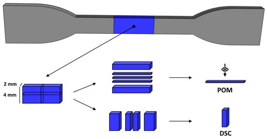 Dimensions of the dumbbell-shaped injection molded samples and cross-sections for POM and DSC analysis.