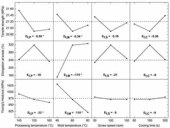 From Figure 3, it can be seen that processing temperature P has the highest influence on tensile strength. Lower processing temperatures result in higher average tensile strength values (negative main effect). The main effect of processing temperature on tensile strength equals −0.59 MPa. The effect of mold temperature M on tensile strength is lower and equals −0.34 MPa. The influence of screw speed S and cooling time C on tensile strength is more limited ( = −0.19 MPa and = +0.26 MPa). It is also apparent from Figure 3 that mold temperature M has the highest impact on elongation at break. High mold temperatures result in extensively increased elongation at break values. The main effect of mold temperature on elongation at break ( equals +175%. On the contrary, the effect of processing temperature P, screw speed S, and cooling time C is limited ( = −10%, = +21% and = +8%). Further, an increased mold temperature M results in lower average Young’s modulus values (negative main effect). The main effect of mold temperature on Young’s modulus is −110 MPa. The effect of processing temperature P ( = −33 MPa) is lower, while the effect of screw speed S ( = −9 MPa) and cooling time C ( = +9 MPa) are limited.