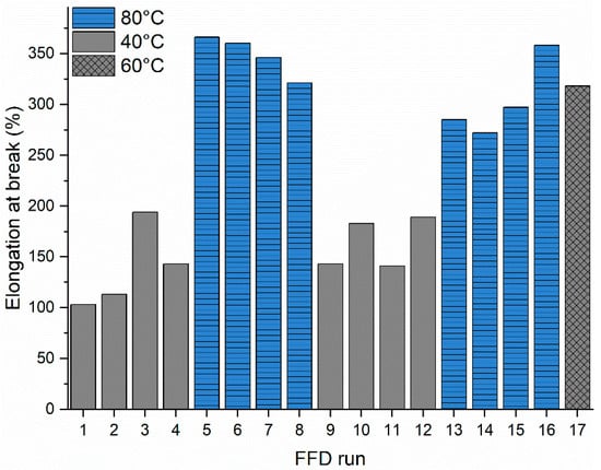 The FFD and developed prediction models revealed that the mold temperature M has a significant impact on the mechanical properties of the melt-processed PHBHHx (Table 4). Figure 4 graphically shows that the elongation at break of injection molded samples significantly increases with mold temperature M up to 80 °C and deteriorates at low mold temperature M = 40 °C.