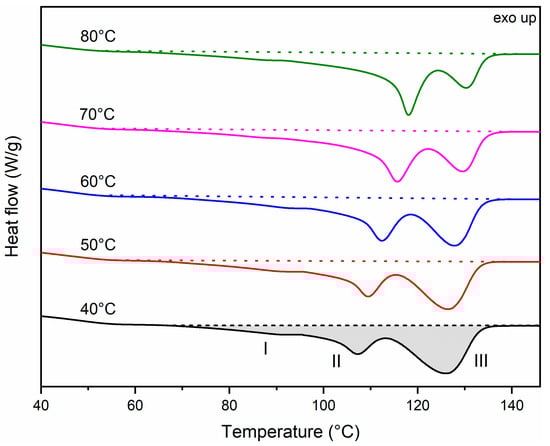 The DSC first heating curves of samples molded at temperatures of M = 40–80 °C are shown in Figure 6. The glass transition temperature (Tg) of all samples equals −1 to 1 °C (similar to the literature [48,58]). As no shift is observed, Tg is not shown in Figure 6. Three endothermal peaks are apparent in this first heating curve. The small peak I at ±84–89 °C can be attributed to the melting of secondary crystallites formed during secondary crystallization/molding. Peak II at ±107–119 °C is due to the melting of primary lamellae [16,59]. Peak III is due to the melting of lamellae formed through thickening and reorganization during DSC heating [16,32]. It is apparent from Figure 6 that the melting peak temperature of the primary lamellae (peak II) shifts to higher temperatures and the peak area increases when processed at elevated mold temperatures (less recrystallization during DSC). Allowing time to crystallize at higher temperatures in the mold leads to increased crystal sizes with higher melting points. In addition, the area of peak III decreases with increasing mold temperature, indicating a less exhaustive recrystallization process during heating. All peak temperatures are shown in Table 10.