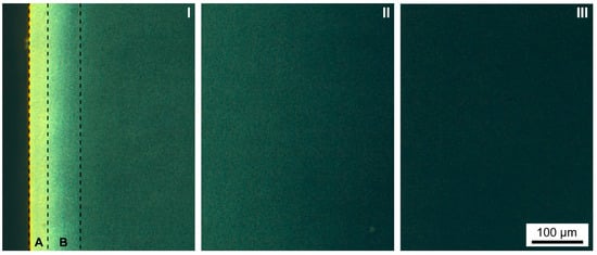 POM was performed on injection molded samples to investigate the semicrystalline morphology and induced microstructure. A BH-2 type microscope (Olympus, Tokyo, Japan) equipped with a ProgRes® CF color camera and ProgRes® Capture Pro software was used. Specimens of the narrow part of the tensile bar center were retrieved and embedded in paraffin wax for increased cutting surface and adequate clamping in the microtome apparatus. The paraffine embedded specimens were cut into 40 µm thin sections along the polymer flow direction with an RM2125 RTS manual rotary microtome (Leica, Wetzlar, Germany). The thin film samples were measured while the injection direction was at an angle of approximately 45° to the crossed polarizer and analyzer. The direction of measurement and microtome cutting of the injection molded samples are shown in Figure 2.