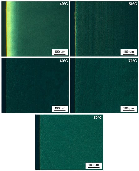 To investigate the impact of the mold temperature in further detail, additional samples (n = 10) were processed at varying mold temperatures (M = 40, 50, 60, 70, 80 °C) with P = 145 °C, S = 50 rpm, and C = 60 s).