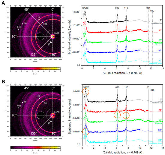 In Equation (7), represents the intensity of the 110 reflection at a given azimuthal angle φ and integrated over 2θ. The peak integrals were obtained after separating them from the patterns using straight sectors.