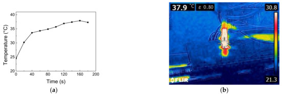 (a) Working temperature and (b) infrared thermal image during DBDjet processing.
