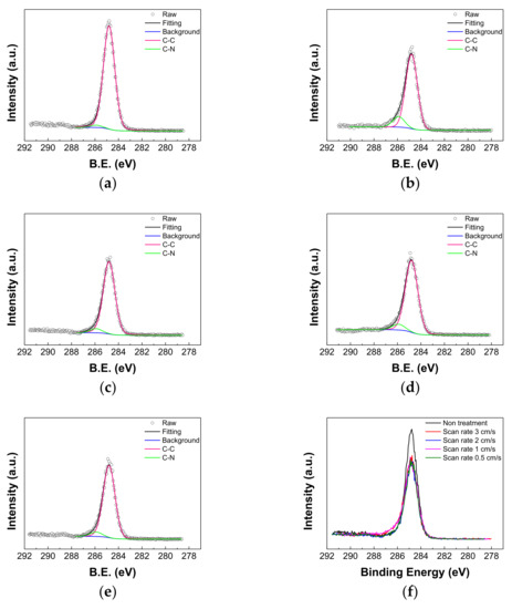 All binding energies were referenced to C1s (284.8 eV). Figure 3 shows the structure of BCP. Figure 4 shows the XPS C1s spectra of the BCP film with and without the He DBDjet treatment and a superimposed XPS C1s spectra. The peaks at 284.8 and 285.9 eV corresponded to C–C and C–N, respectively [48]. Table 1 lists the contents of the corresponding deconvolution peaks. Owing to the reaction between the BCP and the reactive plasma species of the He DBDjet, the intensity of the C–C binding energy peak decreased, as seen in Figure 4f. Then, under the He DBDjet treatment, a lower scan rate resulted in a decrease in the proportion of C–N bonds, as shown in Table 1. However, the amounts of C−N bonds in the samples with the DBDjet scanning were all larger than in those without the DBDjet treatment. This suggests that the environmental nitrogen may participate in the plasma reaction and introduce nitrogen species to the sample. This is evidenced in our previous studies regarding the processing of DBDjet materials [43,49]; reactive nitrogen species are clearly identified in the optical emission spectra of the He DBD jet plasma. These reactive nitrogen species may react with the BCP to form C–N bonds in the first instance. With a higher plasma processing time—i.e., a smaller DBDjet scan rate—the amount of C–N bonds will be lower in turn, possibly owing to the more vigorous plasma reaction or damage to the BCP layer. From the results shown in Figure 4 and Table 1, it may be reasonable to assume that the reactive plasma species in the He DBDjet reacted with the BCP to produce pits (i.e., damage), as seen in the SEM results.