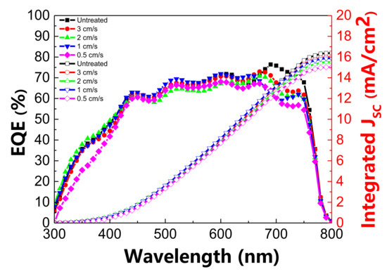 The EQE and corresponding integrated photocurrent curve of the p-i-n-structure PSCs with the He DBDjet treatment on the BCP film are illustrated in Figure 5. The results indicate that the He DBDjet treatment slightly deteriorated the EQE and the corresponding integrated photocurrent. The wavelength range of 650 to 750 nm had the greatest influence. The integrated photocurrent decreased from 16.387 (without DBDjet treatment) to 15.031 mA cm−2 (with DBDjet treatment at the lowest scan rate of 0.5 cm/s). At the lowest scan rate of 0.5 cm/s, the plasma influencing time is longer; therefore, the EQE degradation was more apparent. Additional degradation apparently occurred in the wavelength range of 300–400 nm at a DBDjet scan rate of 0.5 cm/s. The EQE possibly decreased due to more interface charge accumulation or radiative recombination [13,23]. Because the DBDjet plasma working temperature was below 40 °C, this result was mainly attributed to the reactive plasma species.