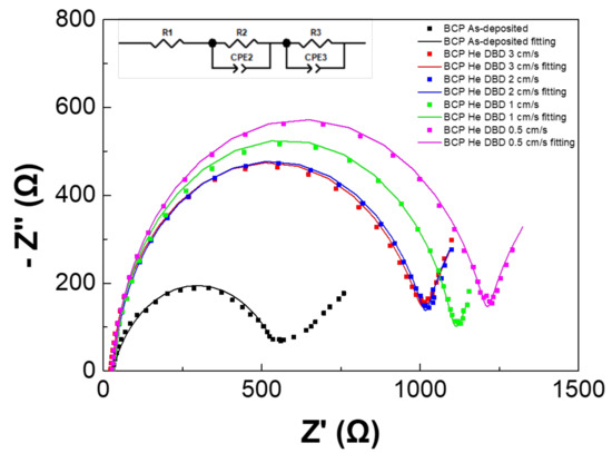 Figure 6 shows a Nyquist plot of the EIS. Its inset shows the equivalent circuit for analyses. Further, Table S1 lists the EIS fitting parameters. R1, R2, and R3 correspond to the series resistance, charge transporting resistance, and recombination resistance, respectively [42,50]. Because the same FTO substrates and top electrodes were used for the devices, the R1 is almost the same for the devices. A smaller R1 and R2 could provide benefits through the encouragement of photogenerated carriers and transportation to the corresponding HTL and ETL [51]. The R2 increased (higher charge transporting resistance) after the He DBDjet treatment on the BCP layer. More specifically, the R2 monotonically increased with a decrease in the He DBDjet scan rate. This suggests that the carrier transport between the BCP layer and the Ag was degraded [42] after the DBDjet treatment.