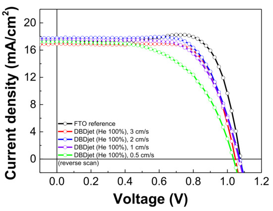 J–V curves of PSCs with He DBDjet treatment on the BCP layer (reverse scan).