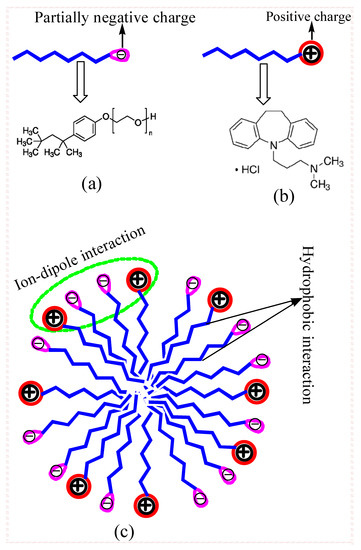 Usually, amphiphilic compounds undergo self-association into certain solvents to a rich diversity of phases liable upon their concentration as well as the solution environments, for instance, pH, temperature, and additive concentration, and so on [1,2,3,4,5]. The assembly of amphiphiles is called micelles and they have many applications in various fields such as materials synthesis, detergency, solubilization, pharmaceutical formulations, and so on [1,6,7,8]. The efficiency of surfactant implication for a certain utilization depends on their interfacial activity as well as solution mechanical/physical parameters of the associates’ structure, for example, size, shape, micellar inter-molecular interactions, and so on [9,10]. Hence, it is important to identify the basic as well as dynamic parameters of the amphiphile systems under needed experimental situations for a specific function. Despite the implication of a singular surfactant for any particular application, almost in all cases, a mixture of surfactants has been broadly used because the mixed system works show much improved properties compared with singular constituents [1,11,12]. The properties of amphiphile mixtures are generally vulnerable to the interaction amongst amphiphile monomers. These amphiphile mixtures, consisting of outstanding properties, are generally concerning the synergistic interaction amongst employed constituents, for example, the binary mixed system of ionic–nonionic, ionic–ionic molecules [1,13,14,15]. Mahajan and Nandni [16] investigated the micellization and phase behavior of binary mixtures of anionic (sodium alkyl phenol ether sulfate/sodiumbis(2-ethylhexyl) sulfosuccinate) and nonionic (polyoxyethylene alkyl ether surfactants) surfactants in aqueous media and found synergistic interactions between the constituents. Sanan and Mahajan [17] studied the interactions between mixed micelles of nonionic surfactant such as Tween and cationic surfactants such as dodecylbenzyldimethylammonium chloride and detected that the cmc of cationic surfactant decreased in the presence of Tween due to attractive interaction amongst employed components, as Tween monomers are intercalated into the cationic micelles.