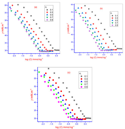 Graph of surface tension (γ) against concentration (C) plot for the IMP + TX-100 mixture in various mole fraction (α1) of TX-100 in (a) aqueous, (b) 0.050 mol∙kg−1 aqueous NaCl, and (c) 0.250 mol∙kg−1 aqueous U media.