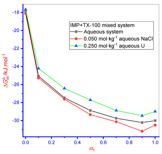 In Equation (7), Xcmc symbolizes the cmc in mole fractions. Here, the value of attained for each system of all media was negative, showing that pure/mixed association was a spontaneous process (Figure 3). Higher negative value of was found for the case of mixture (IMP + TX-100) micellization than for the value of the pure IMP micellization phenomena, demonstrating that spontaneity was greater in binary solution mixtures. The value of pure TX-100 was attained in a higher magnitude than the value of pure IMP, showing that TX-100 had more spontaneity as well as hydrophobicity than IMP (Figure 3). Consequently, the association was smoothed in TX-100 than in IMP. Additionally, with enhanced α1 in mixed systems, an increase in the negative value occurred, thus endorsing the spontaneity of the mixtures through an increase in α1 value and at the highest α1, their values were beyond the value of both components (Figure 3). In the aqueous solution, the value for singular IMP was −17.82 kJ·mol–1, which well agreed with an earlier report (−17.90 kJ·mol–1) [54]. Additionally, the value by singular TX-100 was also found to be similar to the previously reported value [55].