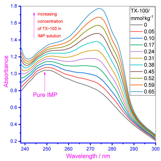 To further investigate the molecular interaction of the employed drug IMP with TX-100, another spectroscopic method—UV–visible was used [61]. The aromatic ring of the IMP drug is liable for their considerable absorption characteristic. The absorption spectra of the drug were noted through increasing TX-100 concentration and the obtained results are given in Figure 4 for an aqueous system. The solution of TX-100 was prepared in the presence of 0.10 mmol·kg−1 IMP to avoid a dilution effect during titration. The spectra of IMP (0.10 mmol·kg−1) depicted one clear maximum absorption wavelength (λmax) at 249 nm in the aqueous system, which was ascribed to π–π* transition. Effect of increasing the TX-100 concentration is noted on the absorption spectra of IMP of fixed concentration (concentration of TX-100 varies from 0.05 mmol·kg−1 to 0.65 mmol·kg−1 in IMP solutions) (Figure 4). With the addition of TX-100 in the solution of IMP, the absorption strength of drug enhanced (i.e., hyperchromic effect occurred due to the H-bonding and electrostatic interaction) between the employed components [22,62]. At a lower concentration of TX-100, that the spectral peak of IMP (249 nm) shifted toward the higher wavelength means that in the mixtures, red shifting occurred, authorizing the interaction between IMP and the TX-100 mixture. Some of the initially added concentration of TX-100 into the IMP solution exist in their monomer form and after further addition of TX-100 into the solution of IMP, TX-100 monomeric forms turn into the micellar form and the initially obtained peak (near to 249 nm) disappeared due to complex formation between the components. A new peak appeared at a higher wavelength (above 275 nm) and showed higher wavelengths with the addition of more TX-100. At higher concentrations of the surfactant, the intercalation of IMP molecules inside the palisade layer of the surfactant micelles took place and possibly a new peak (above 275 nm) mainly occurred due to TX-100 [63]. Therefore, the overall results of titration specify the strong interaction of IMP with TX-100 as the absorption increased with an increase in TX-100 concentration. Red shift (more than 25 nm) was also detected (obtained redshift showed a rise in the wavelength and related reduction in the frequency along with photon energy of electromagnetic emission), due to the IMP–TX-100 complex formation. Attraction between IMP and TX-100 could also be due to no charge being present on the head group of non-ionic TX-100, attracting positively charged IMP drug monomers. Therefore, complexation was detected between IMP and TX-100.