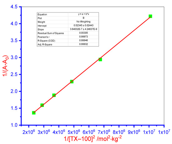 The plot of 1/(A − A0) against 1/[TX-100]2 for the interaction of the IMP drug with TX-100.