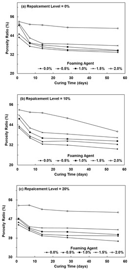 For the lightweight FGP with an SCS replacement level of 0%, increasing the amount of foaming agent to 2.0% for 28 days increased the porosity ratio to 49.26%, as shown in Figure 2. Previous studies have pointed out that for a geopolymer with a high initial concentration of H2O2, the porosity ratio increased with an increasing volume expansion ratio [18]. When the SCS replacement levels were 10% and the amount of added foaming agent was 2.0%, the porosity ratio of the lightweight FGP increased from 31.88% to 40.03%. The results showed that the porosity ratio increased with increasing amounts of added hydrogen peroxide. Because the system was affected by the presence of SiC, which caused the k value of the O2 reaction to decrease, there was a synergistic effect between SiC sludge and metakaolin, which formed more hydration products to fill the pores [24]. In addition, when the SCS replacement levels were 20%, and the amount of added foaming agent was 2.0%, the porosity ratio of the lightweight FGP was 47.96%, which showed that the porosity ratio significantly increased with increasing foaming agent amounts. Novais et al. (2016) used 0.03%, 0.15%, 0.30%, 0.90%, and 1.2% hydrogen peroxide as the foaming agent to produce porous fly ash-based geopolymers. The results showed that the bulk density was 0.6–1.2 g/cm3, and the porosity ratio was 42–73% [18]; the porosity ratio results were consistent with our study of a sample with a 2.0% foaming agent.