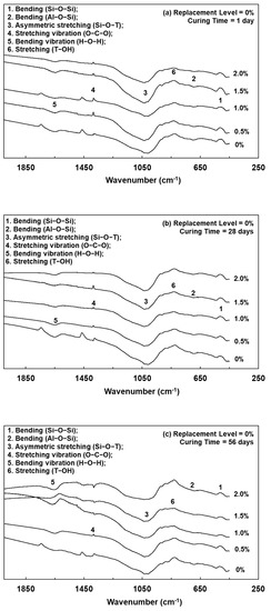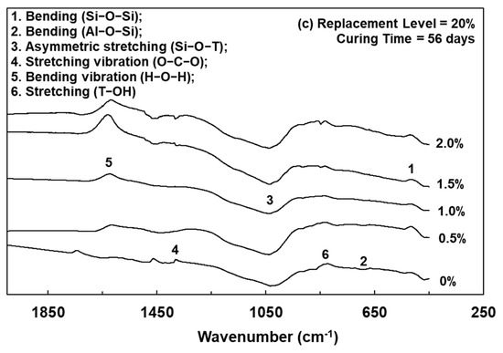 Lightweight FGPs with different SCS replacement levels and added H2O2 solution levels were analyzed by FTIR spectrum, as shown in Figure 3, Figure 4 and Figure 5. It can be seen from Figure 5 that when the SCS replacement level was 0% and after curing for 1 day, the sample without any added foaming agent had bands at 1028, 700, and 470 cm−1, corresponding to Si–O–T asymmetric bonding (where T = Al or Si), Al–O–Si bonding and Si–O–Si bonding, respectively [20]. When the amount of added foaming agent was 0.5%, 1.0%, 1.5%, and 2.0%, the same bands were observed. When the curing age was 56 days, after geopolymerization of the lightweight FGP material, the wavenumber of the peak corresponding to Si–O–T asymmetric bonding at 1028 cm−1 shifted to 998 cm−1. The results show that the peak attributed to Si–O–T asymmetric bonding shifted to a lower wavenumber with increasing curing time.