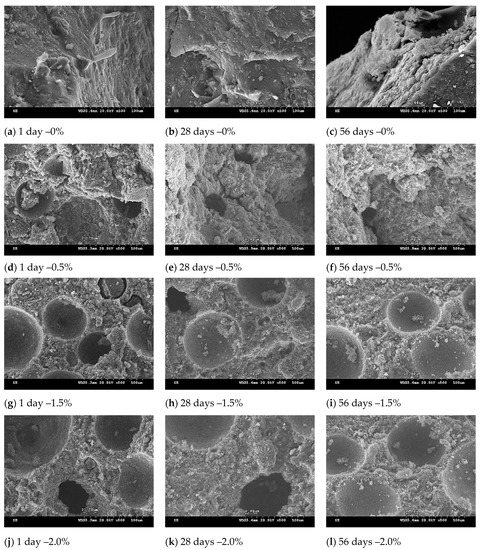 Figure 6, Figure 7 and Figure 8 showed the microstructure of the lightweight FGPs with different SCS replacement levels, different added H2O2 solution levels, and curing times of 1–56 days. The results show that for lightweight FGPs with an SCS replacement level of 0%, an amount of added foaming agent of 0.5%, and a curing time of 1 day, the bubbles remaining in the lightweight FGP material creates voids (large pores), which was observed after adding the foaming agent, but the edge angle structure was still be observed. When the amount of added foaming agent was 2.0%, and the SCS replacement level was 10%, the sample showed dispersed large pores, which was attributed to the bubbles remaining in the paste during dissolution and the polycondensation reaction [27]. In addition, plate-like particles were also observed in the structure because the amount of added H2O2 solution did not change the rate of geopolymerization [18].
