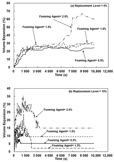 Figure 9 shows the volume expansion ratio of the lightweight FGP prepared with different SCS replacement levels and added H2O2 solution levels. It was known from Figure 9a that when the SCS replacement level was 0%, and the addition amount of the H2O2 solution was 0.5%, the volume expansion rate increased with increased reaction times. Because H2O2 was thermodynamically unstable in the basic medium, it easily decomposed into water and oxygen [19]. As the amount of added H2O2 solution increased from 1.0% to 2.0%, the volume expansion ratios of the lightweight FGPs increased from 8.21% to 60.53% (Figure 9a). This showed that the higher the initial concentration of the H2O2 solution is, the greater the volume expansion ratio, and our research results were consistent with previous research [18]. In addition, when the SCS replacement levels and the added H2O2 solution amount were 10% and 0.5%, the volume expansion ratio of the lightweight FGP was 5.26%. As the added amount of H2O2 solution was increased to 2%, the volume expansion ratio of the lightweight FGP increased to 15.00% because H2O2 was continuously reacted to form water and oxygen in the system. When the added amount of H2O2 solution was 0.5%, and the SCS replacement levels were 20–40%, the volume expansion ratio of the lightweight FGPs gradually decreased to 4.65%, 4.76%, and 3.20%. When the silicon carbide sludge existed in this environment, the H2O2 reaction tended to release •OH, and its redox reaction was very strong, accelerating the decomposition of H2O2 and O2 [21,22]; therefore, it was difficult to control the morphology, size, particle-size distribution and porosity of the FGP, resulting in a lightweight FGP with a weak and unstable structure after foaming. Hence, when the SCS replacement levels were 20–40%, and the added amount of H2O2 solution was 2.0%, the volume expansion ratios of the lightweight FGPs were 6.98–8.49%, which were all below the 0% and 10% SCS replacement levels of the lightweight FGPs, as shown in Figure 9.