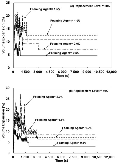 The volume expansion ratio of lightweight FGPs with SCS replacement levels. (a) 0%; (b) 10%; (c) 20% and (d) 40%.