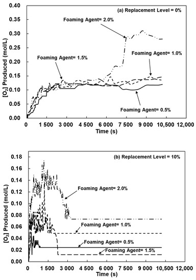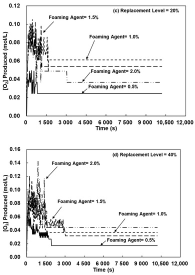 According to Equations (5) and (6), the k value of the first-order reaction rate constant and oxygen concentration [O2] value were calculated, and the results are listed in Table 6 and Figure 10. The results showed that when the SCS replacement level was 0% and the added H2O2 solution amount was 0.5%, the oxygen concentration [O2] was 0.12 mol/L; the oxygen concentration [O2] increased to 0.281 mol/L when the amount of added hydrogen peroxide was 2.0%, and the k value of the first-order reaction increased from 3.82 × 10−4 to 4.69 × 10−4. This showed that increasing the concentration of H2O2 in the system promoted the decomposition of H2O2 into water and O2, and our research results were consistent with those of Petlitckaia et al. (2019) [19]. Additionally, the results of the foaming kinetic analysis of the lightweight FGP with 10% SCS replacement levels showed that when the added H2O2 solution amount increased from 0.5% to 2.0%, the O2 concentration increased from 0.024 to 0.073 mol/L. However, due to the influence of the presence of SiC, the chemical reaction will preferentially involve •OH to form CO2 [22,23], and the k value of the O2 reaction decreased from 2.94 × 10−4 to 1.76 × 10−4. When the amount of added H2O2 solution was 2.0%, and the SCS replacement levels were 20–40%, the O2 concentrations were 0.037, 0.049, and 0.044 mol/L, which showed that adding too much SCS caused the reaction kinetics to preferentially form CO2. Therefore, when the SCS replacement levels were 20–40%, the reaction consumed O2 to form CO2 in the system, while the k value of the O2 reaction was lower than that of the samples with 0% and 10% SCS replacement levels, in which the rate constants were 1.76 × 10−4, 1.36 × 10−4, and 1.76 × 10−4 (Table 6).