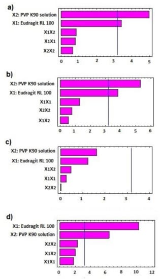 The statistical effects of Eudragit RL 100 (X1) and PVP K90 solution (X2) on the peak torque values of the AC pellets’ wet mass are illustrated in Table 2, as well as the Pareto chart in Figure 1. The ANOVA results depicted in Table 2 indicate that Eudragit exerted a significant antagonistic effect on wet mass peak torque (p = 0.042), while PVP solution showed significant synergistic action on pellets’ wet mass peak torque (p = 0.016). Only the individual effects of Eudragit and PVP exhibited significant effects on wet mass, while other interactive quadratic effects were found to be insignificant, as displayed in the response surface plot (Figure 2a). It is worth mentioning that the binder ratio (mL of PVP solution required for wet mass peak torque) varied according to the composition of the pellet formula. The binder ratios of the tested wet masses ranged from 0.667 to 0.933 mL/g, as shown in Table 3. As shown in Table 2 and Figure 3, pellet formulae AC2 and AC5 (composed of 10% and 0% Eudragit, respectively, and 5% PVP binder solution) exhibited the greatest peak torque values (0.81 ± 0.047 and 0.789 ± 0.071 Nm, respectively) amongst the tested wet masses. On the other hand, AC3 pellet wet mass showed the lowest peak torque value amongst the formulations. Increasing the concentration of the binder solution (PVP K90) resulted in an increase in the mean line torque of the wet mass. This could be due to the increased cohesiveness of the powder mass and the mean torque line upon increasing the PVP concentration [25]. Additionally, Alshora et al. [15] indicated that increasing the concentration of PVP K30 as a binder resulted in an increase in the wet mass peak torque values of flurbiprofen pellets. Moreover, the level of Eudragit L 100 polymer in the pellet wet mass resulted in a reduction in the peak torque of the wet mass.