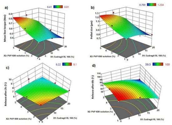 By rendering the pH more alkaline, the release of AC sped up, due to the ionization of Eudragit at alkaline pH. At this stage, the Pareto chart (Figure 1d) and the response surface (Figure 2d) showed significant antagonistic effects of Eudragit RL100 (p = 0.002) and PVP K90 (p = 0.007) (Table 1) on the release. This indicates that increasing the Eudragit concentration to the intermediate point resulted in enhancing AC release from the pellets at low PVP solution concentrations. Formulations (AC1, AC7, AC8) containing 1 and 3% PVP K90 and 0, 10, and 0% Eudragit, respectively, showed the highest release rates amongst the tested formulae (100.00 ± 5.51, 92.78 ± 6.52, and 98.7 ± 4.87, respectively). However, at high Eudragit concentrations (20%), the drug exhibited slow release rates, as was the case for pellet formulae AC3, AC6, and AC9, which contained 20% Eudragit and 1, 5, and 3% PVPB, respectively. The wet mass peak values of these formulations were low, with small particle sizes, as shown in Table 3. At the lowest Eudragit RL 100 concentration, and with increasing the concentration of the binder solution, increasing the mean torque line from 0.513 (AC1) to 0.789 Nm (AC5) dramatically increased the pellets’ size, from 9.14 to 1.187 µm, respectively (Table 3). This increase in the pellet size significantly reduced the release after 8 h, from 100 to 78.52%. A similar finding was obtained by Ibrahim et al. [27], who revealed an inverse relationship between the peak torque values of pellet wet mass and indomethacin release rate from pellet formulations. Moreover, Ibrahim et al. [21] indicated that at a low pellet wet mass, the peak torque was associated with small pellet size and, hence, a rapid drug release rate.